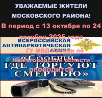 Администрация Московского района города Нижнего Новгорода, отвечающая за сферу образования, информирует о проведении II этапа общероссийской акции «Сообщи, где торгуют смертью» в период с 14 по 25 октября 2024 года.