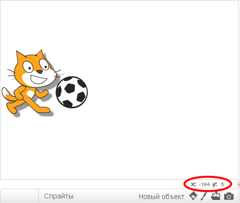 Попробуйте очень аккуратно переместить курсор в центр сцены. Координаты центральной точки сцены Х = 0 и Y = 0. Теперь кликните на Котёнка и перемещайте его в левую часть экрана. Запомните его координаты.