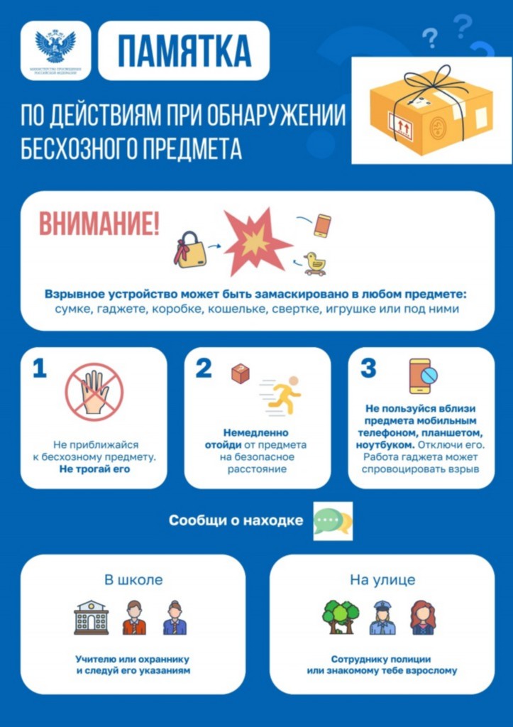 Если вы обнаружили неизвестный предмет в учреждении, немедленно сообщите о находке администрации или охране.